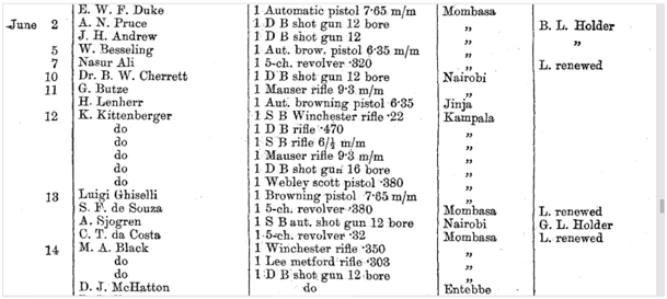 1913-ban az angol vadászati jogszabályok negyedévenként minden vadász számára kötelezővé tették lőfegyvereik nyilvántartásba vételét. A Mombasaba 1913 június 30-val nyilvántartásba vett fegyverek listáját a Kenya Gazeta 1913 augusztus elsejei számában tették közzé. Ebben jelenik meg az akkor Ugandába tartózkodó Kittenberger fegyvereinek jegyzéke is